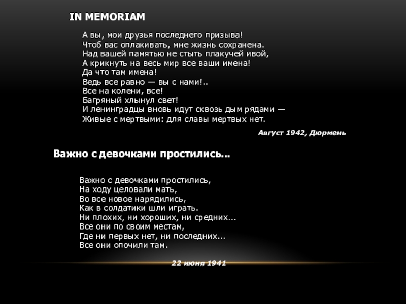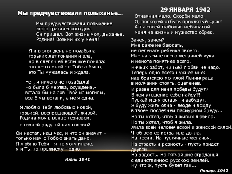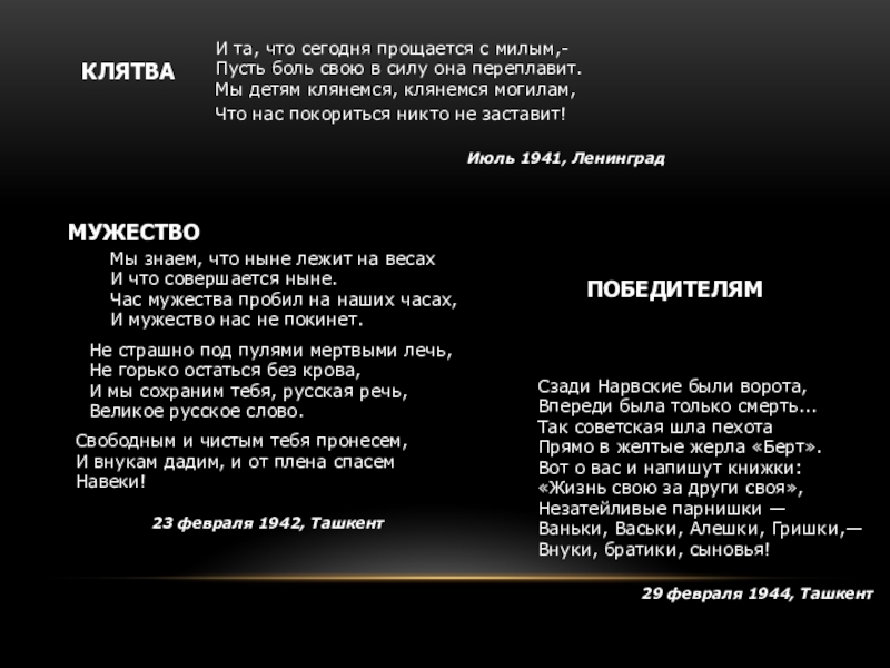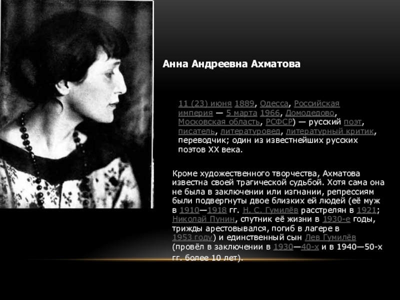 Кроме художественного творчества, Ахматова известна своей трагической судьбой. Хотя сама она не была в заключении или изгнании, репрессиям были подвергнуты двое близких ей людей (её муж в 1910—1918 гг. Н. С. Гумилёв расстрелян в 1921; Николай Пунин, спутник её жизни в 1930-е годы, трижды арестовывался, погиб в лагере в 1953 году) и единственный сын Лев Гумилёв (провёл в заключении в 1930—40-х и в 1940—50-х гг. более 10 лет).