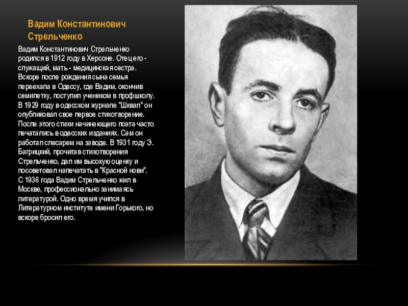 Несмотря на то что Вадим Стрельченко из-за плохого зрения был снят с воинского учета, он в самом начале Отечественной войны пошел добровольцем в народное ополчение, участвовал во многих боях и погиб в 1942 году под Вязьмой.