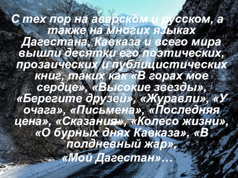 языках Дагестана, Кавказа и всего мира вышли десятки его поэтических, прозаических и публицистических книг, таких как «В горах мое сердце», «Высокие звезды», «Берегите друзей», «Журавли», «У очага», «Письмена», «Последняя цена», «Сказания», «Колесо жизни», «О бурных днях Кавказа», «В полдневный жар»,