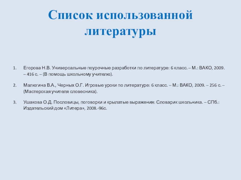 Список использованной литературы Егорова Н.В. Универсальные поурочные разработки по литературе: 6 класс. – М.: ВАКО, 2009. – 416