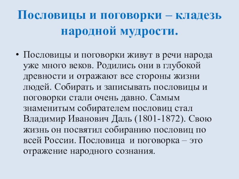 в речи народа уже много веков. Родились они в глубокой древности и отражают все стороны жизни людей. Собирать и записывать пословицы и поговорки стали очень давно. Самым знаменитым собирателем пословиц стал Владимир Иванович Даль (1801-1872). Свою жизнь он посвятил собиранию пословиц по всей России. Пословица и поговорка – это отражение народного сознания.