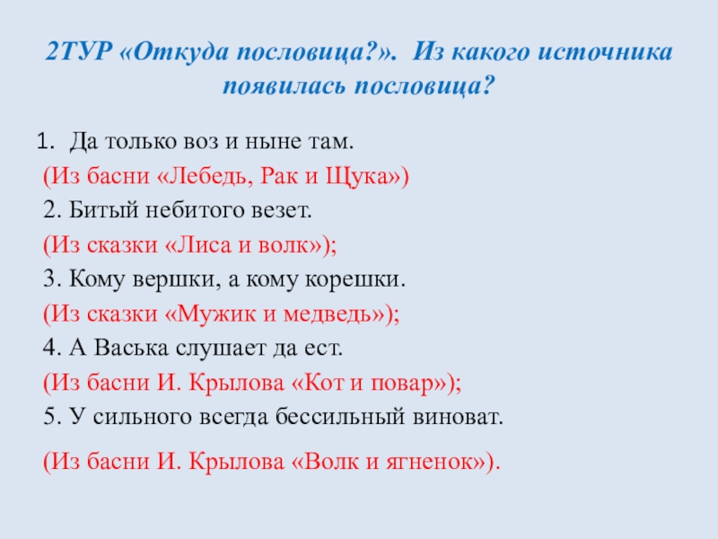 2ТУР «Откуда пословица?». Из какого источника появилась пословица? Да только воз и ныне там. (Из басни «Лебедь,