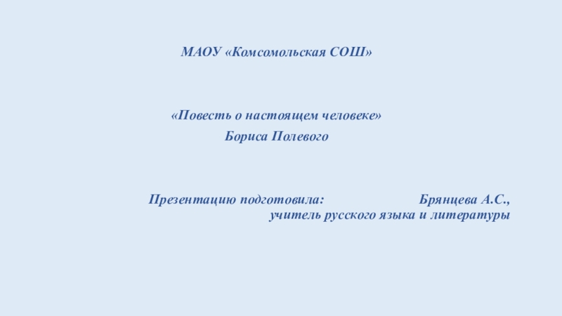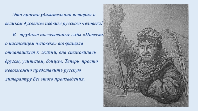 трудные послевоенные годы «Повесть о настоящем человеке» возвращала отчаявшихся к жизни, она становилась другом, учителем, бойцом. Теперь просто невозможно представить русскую литературу без этого произведения.