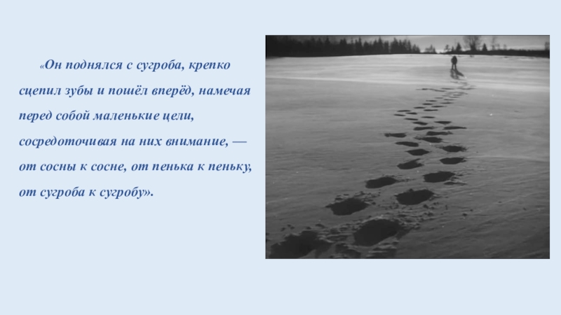 Слайд 12 «Он поднялся с сугроба, крепко сцепил зубы и пошёл вперёд, намечая перед собой маленькие