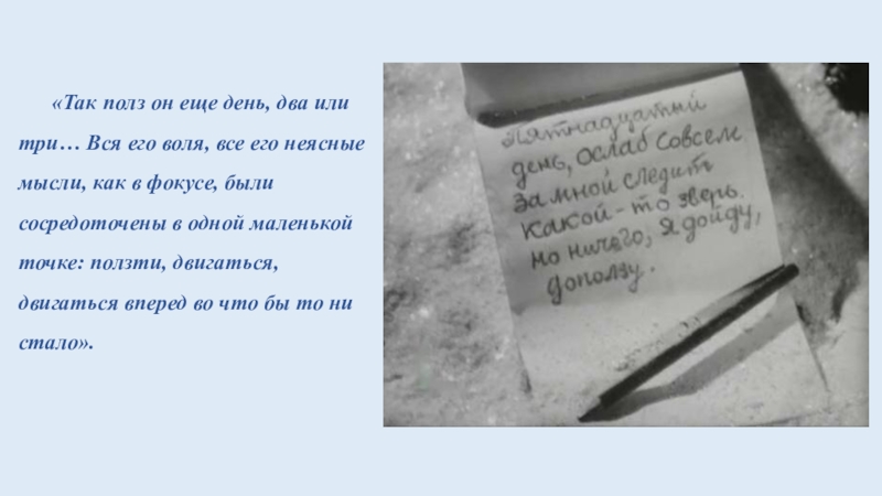 Слайд 13 «Так полз он еще день, два или три… Вся его воля,