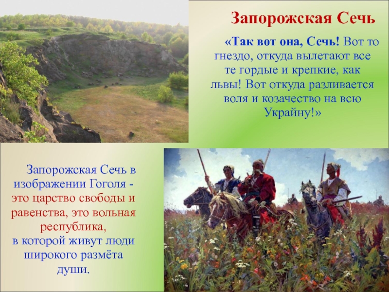 Запорожская Сечь в изображении Гоголя - это царство свободы и равенства, это вольная республика, в которой живут люди широкого размёта души.