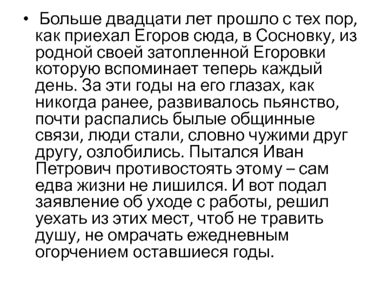 Слайд 12 Больше двадцати лет прошло с тех пор, как приехал Егоров