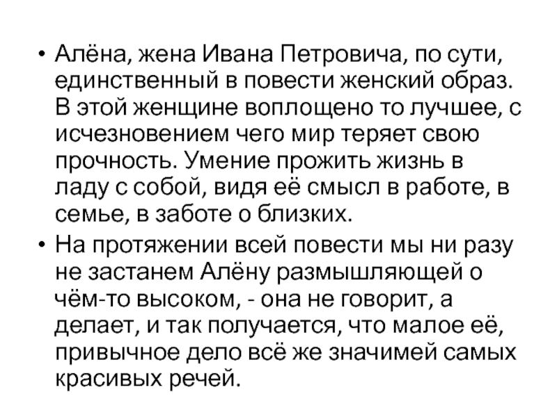 Слайд 15Алёна, жена Ивана Петровича, по сути, единственный в повести женский образ.