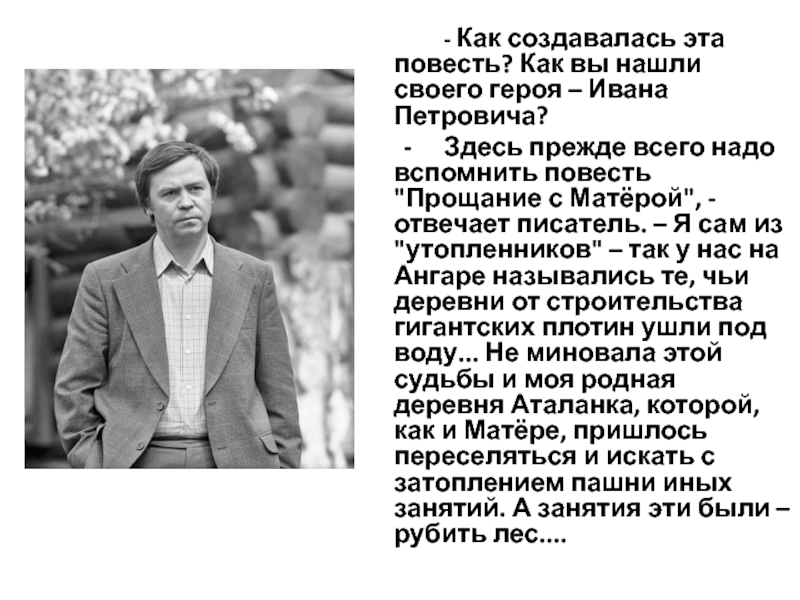- Здесь прежде всего надо вспомнить повесть "Прощание с Матёрой", - отвечает писатель. – Я сам из "утопленников" – так у нас на Ангаре назывались те, чьи деревни от строительства гигантских плотин ушли под воду... Не миновала этой судьбы и моя родная деревня Аталанка, которой, как и Матёре, пришлось переселяться и искать с затоплением пашни иных занятий. А занятия эти были – рубить лес....