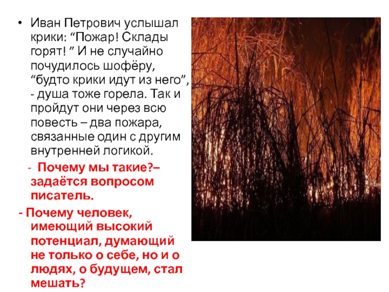 Слайд 7Иван Петрович услышал крики: “Пожар! Склады горят! ” И не случайно