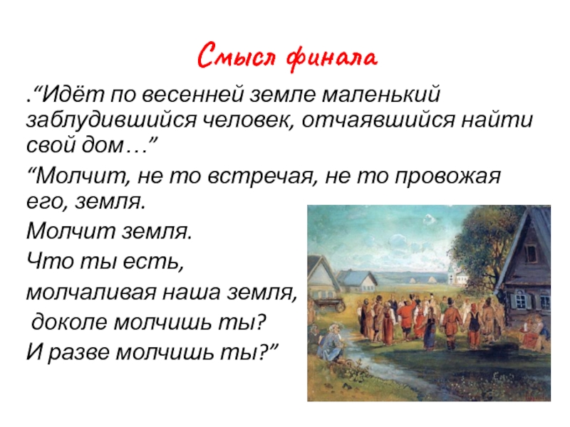.“Идёт по весенней земле маленький заблудившийся человек, отчаявшийся найти свой