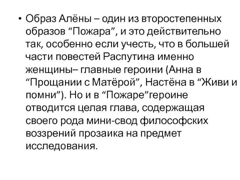 так, особенно если учесть, что в большей части повестей Распутина именно женщины– главные героини (Анна в “Прощании с Матёрой”, Настёна в “Живи и помни”). Но и в “Пожаре”героине отводится целая глава, содержащая своего рода мини-свод философских воззрений прозаика на предмет исследования.