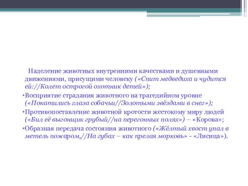 Наделение животных внутренними качествами и душевными движениями, присущими человеку («Спит медведиха и чудится ей://Колет острогой охотник детей»);