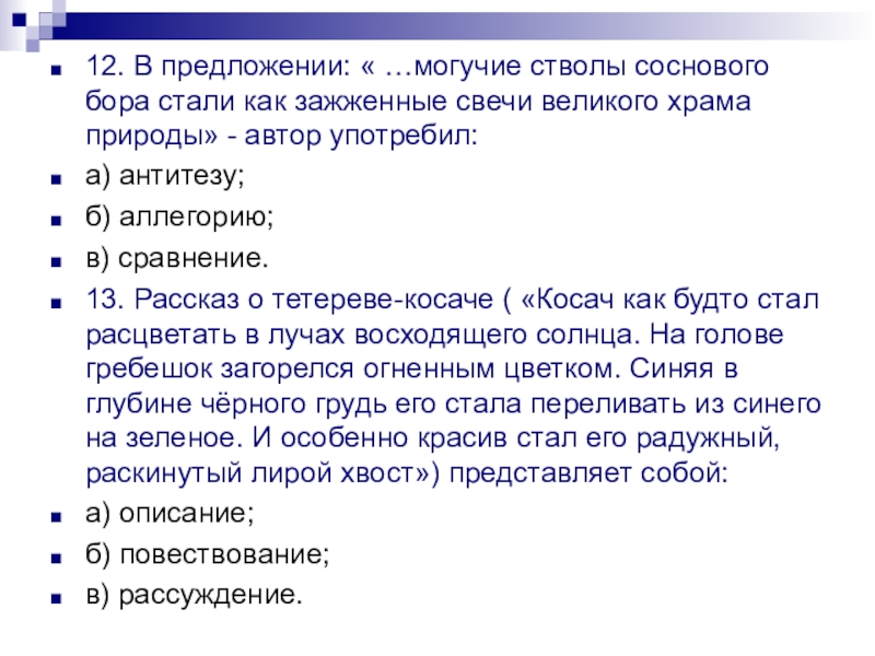 13. Рассказ о тетереве-косаче ( «Косач как будто стал расцветать в лучах восходящего солнца. На голове гребешок загорелся огненным цветком. Синяя в глубине чёрного грудь его стала переливать из синего на зеленое. И особенно красив стал его радужный, раскинутый лирой хвост») представляет собой: