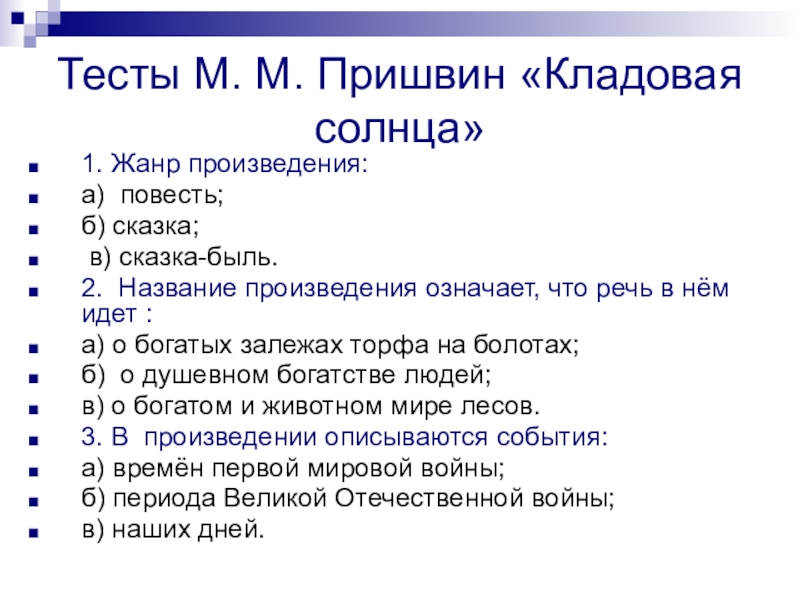 Слайд 14Тесты М. М. Пришвин «Кладовая солнца»