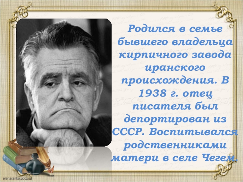 г. отец писателя был депортирован из СССР. Воспитывался родственниками матери в селе Чегем.