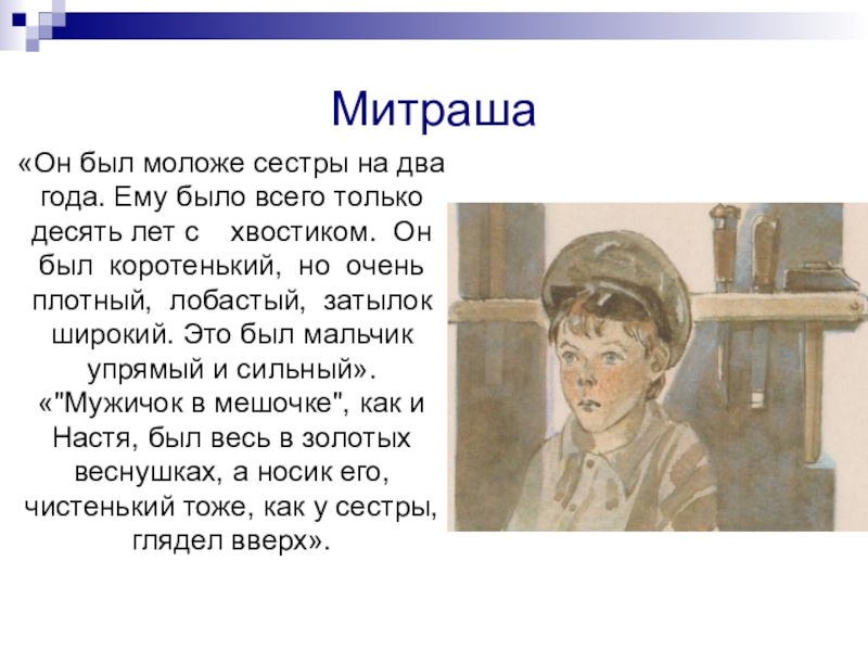 всего только десять лет с хвостиком. Он был коротенький, но очень плотный, лобастый, затылок широкий. Это был мальчик упрямый и сильный». «"Мужичок в мешочке", как и Настя, был весь в золотых веснушках, а носик его, чистенький тоже, как у сестры, глядел вверх».