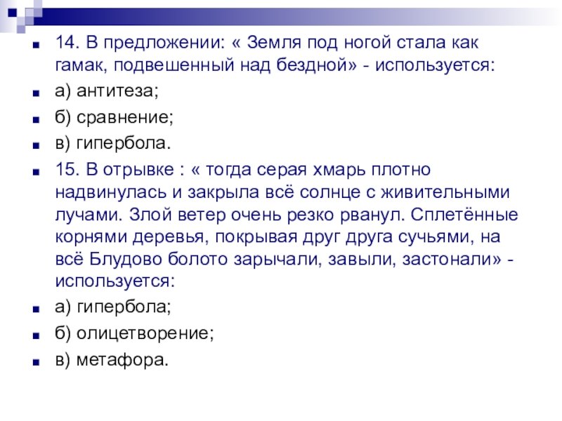 15. В отрывке : « тогда серая хмарь плотно надвинулась и закрыла всё солнце с живительными лучами. Злой ветер очень резко рванул. Сплетённые корнями деревья, покрывая друг друга сучьями, на всё Блудово болото зарычали, завыли, застонали» - используется: