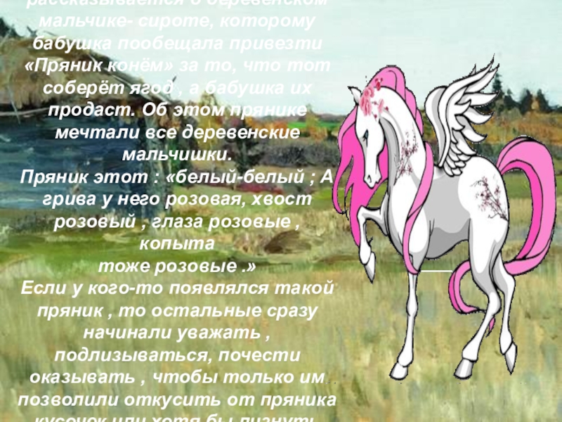 привезти «Пряник конём» за то, что тот соберёт ягод , а бабушка их продаст. Об этом прянике мечтали все деревенские мальчишки.