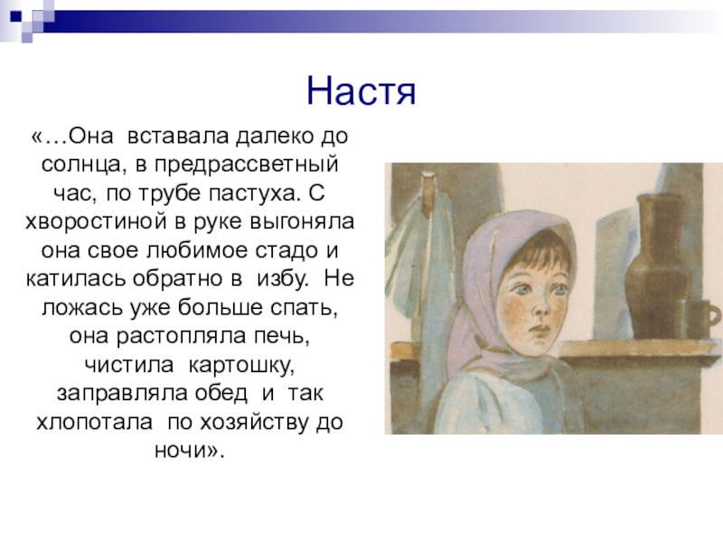 трубе пастуха. С хворостиной в руке выгоняла она свое любимое стадо и катилась обратно в избу. Не ложась уже больше спать, она растопляла печь, чистила картошку, заправляла обед и так хлопотала по хозяйству до ночи».