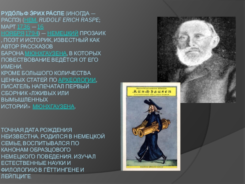 Слайд 2Рудо́льф Э́рих Ра́спе (иногда — Распэ) (нем. Rudolf Erich Raspe; март 1736 — 16 ноября 1794) — немецкий прозаик, поэт и
