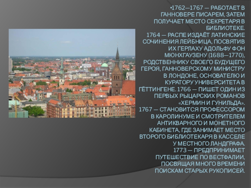 Слайд 31762—1767 — работает в Ганновере писарем, затем получает место секретаря в