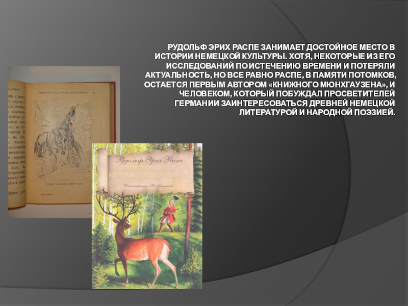 Слайд 5Рудольф Эрих Распе занимает достойное место в истории немецкой культуры. Хотя,
