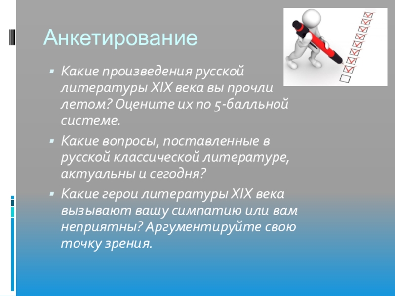 АнкетированиеКакие произведения русской литературы XIX века вы прочли летом? Оцените их по 5-балльной системе.Какие вопросы, поставленные в