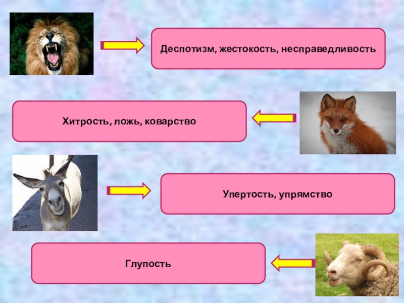 Деспотизм, жестокость, несправедливостьХитрость, ложь, коварствоГлупостьУпертость, упрямство