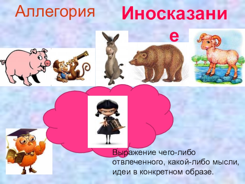 ИносказаниеАллегорияВыражение чего-либо отвлеченного, какой-либо мысли, идеи в конкретном образе.