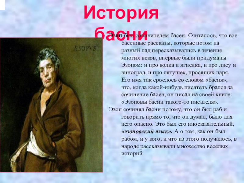 История басниЭзоп был сочинителем басен. Считалось, что все басенные рассказы, которые потом на разный лад пересказывались в
