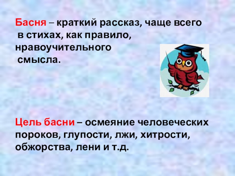 Басня – краткий рассказ, чаще всего в стихах, как правило, нравоучительного смысла.Цель басни – осмеяние человеческих пороков,