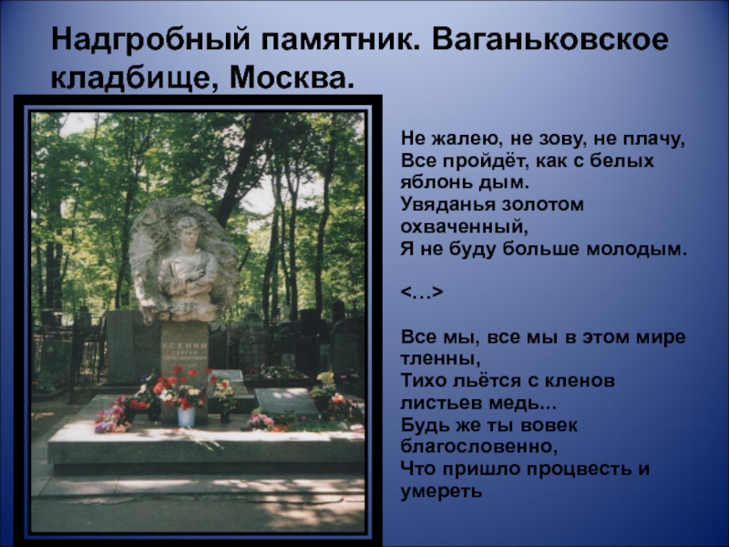 Надгробный памятник. Ваганьковское кладбище, Москва.Не жалею, не зову, не плачу,Все пройдёт, как с белых яблонь дым.Увяданья золотом
