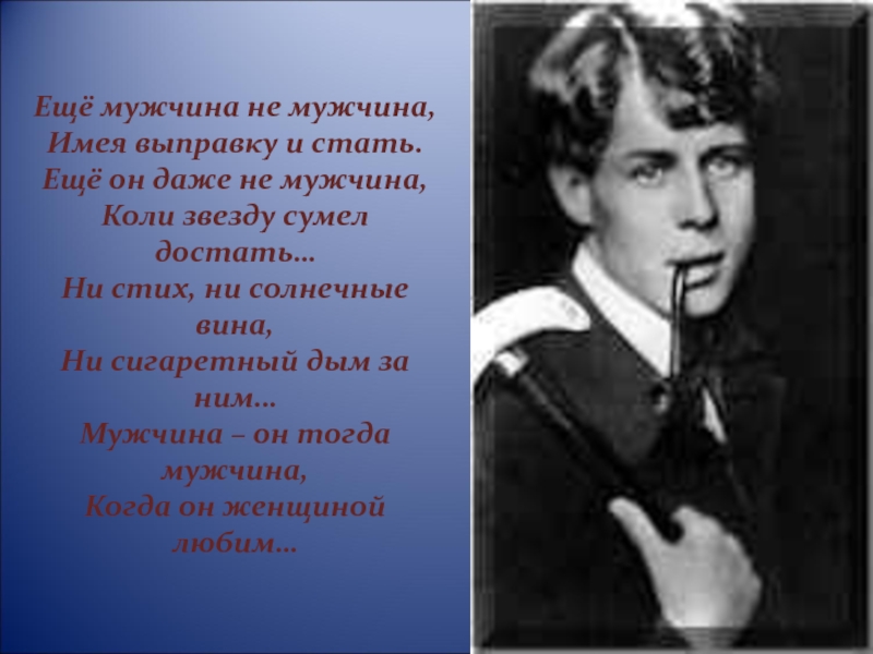Ещё мужчина не мужчина, Имея выправку и стать. Ещё он даже не мужчина, Коли звезду сумел достать…