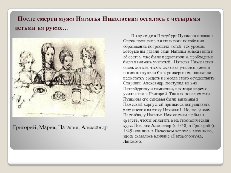 По приезде в Петербург Пушкина подала в Опеку прошение о назначении пособия на образование подросших детей: тех уроков, которые им давали сами Наталья Николаевна и её сестра, уже было недостаточно, необходимо было нанимать учителей. Наталья Николаевна очень хотела, чтобы сыновья учились дома, а потом поступили бы в университет, однако по недостатку средств не могла этого осуществить. Старший, Александр, поступил во 2-ю Петербургскую гимназию, некоторое время учился там и Григорий. Так как после смерти Пушкина его сыновья были записаны в Пажеский корпус, ей пришлось испрашивать разрешения на это у Николая I. Но, по словам Плетнёва, у Натальи Николаевны не было средств, чтобы оплатить весь гимназический курс. Позднее Александр (с 1848) и Григорий (с 1849) учились в Пажеском корпусе, возможно, здесь сказалось влияние её второго мужа, Ланского.