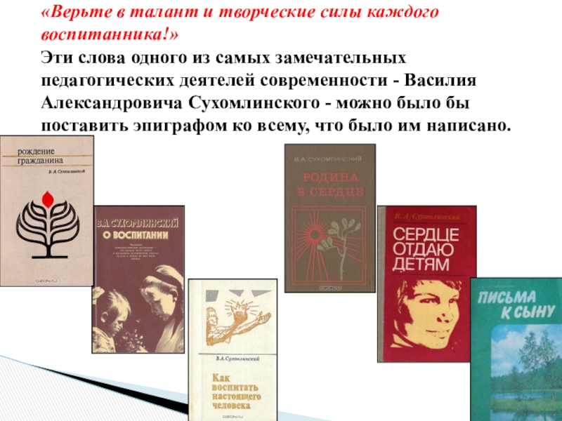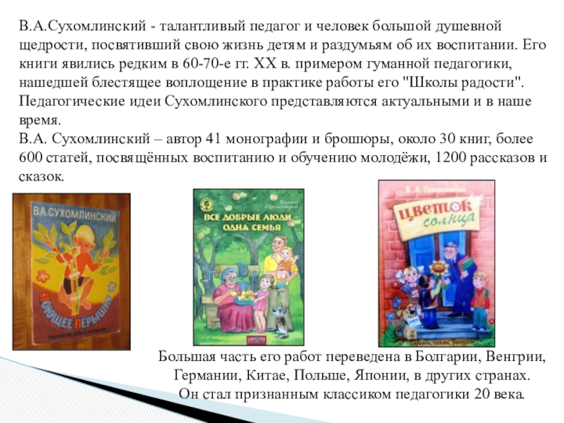 В.А. Сухомлинского заботили прежде всего проблемы индивидуального воспитания подростков, выработки у них четкой мировоззренческой позиции, привития им эмоциональной культуры.