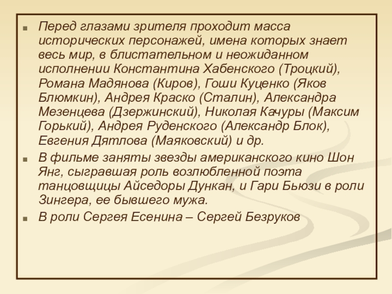 мир, в блистательном и неожиданном исполнении Константина Хабенского (Троцкий), Романа Мадянова (Киров), Гоши Куценко (Яков Блюмкин), Андрея Краско (Сталин), Александра Мезенцева (Дзержинский), Николая Качуры (Максим Горький), Андрея Руденского (Александр Блок), Евгения Дятлова (Маяковский) и др.