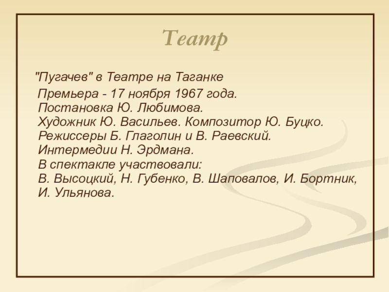 Премьера - 17 ноября 1967 года. Постановка Ю. Любимова. Художник Ю. Васильев. Композитор Ю. Буцко. Режиссеры Б. Глаголин и В. Раевский. Интермедии Н. Эрдмана. В спектакле участвовали: В. Высоцкий, Н. Губенко, В. Шаповалов, И. Бортник, И. Ульянова.