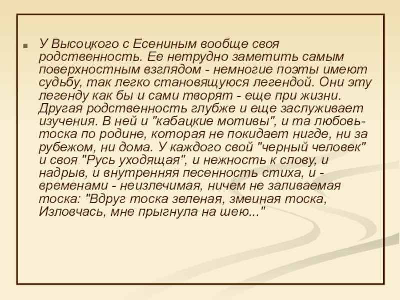 поверхностным взглядом - немногие поэты имеют судьбу, так легко становящуюся легендой. Они эту легенду как бы и сами творят - еще при жизни. Другая родственность глубже и еще заслуживает изучения. В ней и "кабацкие мотивы", и та любовь-тоска по родине, которая не покидает нигде, ни за рубежом, ни дома. У каждого свой "черный человек" и своя "Русь уходящая", и нежность к слову, и надрыв, и внутренняя песенность стиха, и - временами - неизлечимая, ничем не заливаемая тоска: "Вдруг тоска зеленая, змеиная тоска, Изловчась, мне прыгнула на шею..."
