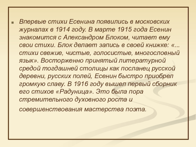 марте 1915 года Есенин знакомится с Александром Блоком, читает ему свои стихи. Блок делает запись в своей книжке: «...стихи свежие, чистые, голосистые, многословный язык». Восторженно принятый литературной средой тогдашней столицы как посланец русской деревни, русских полей, Есенин быстро приобрел громкую славу. В 1916 году вышел первый сборник его стихов «Радуница». Это была пора стремительного духовного роста и совершенствования мастерства поэта.