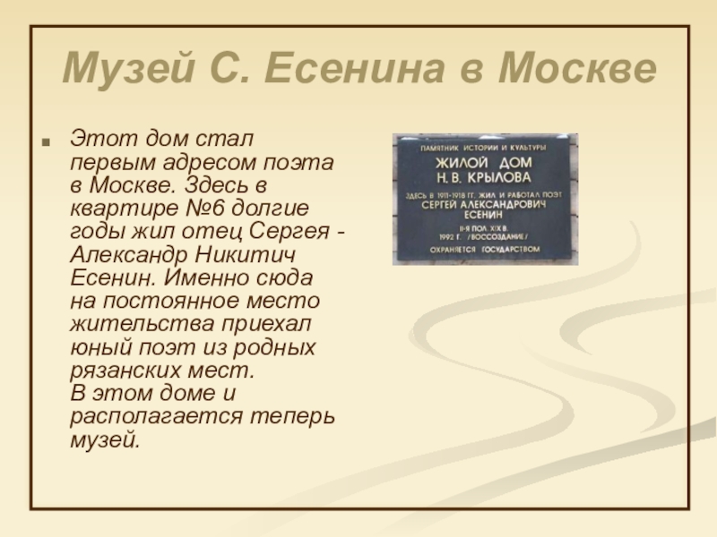 Музей С. Есенина в МосквеЭтот дом стал первым адресом поэта в Москве. Здесь в квартире №6 долгие