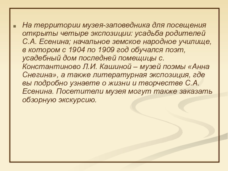 Есенина; начальное земское народное училище, в котором с 1904 по 1909 год обучался поэт, усадебный дом последней помещицы с. Константиново Л.И. Кашиной – музей поэмы «Анна Снегина», а также литературная экспозиция, где вы подробно узнаете о жизни и творчестве С.А. Есенина. Посетители музея могут также заказать обзорную экскурсию.