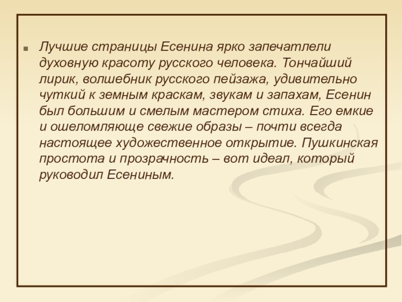 Лучшие страницы Есенина ярко запечатлели духовную красоту русского человека. Тончайший лирик, волшебник русского пейзажа, удивительно чуткий к