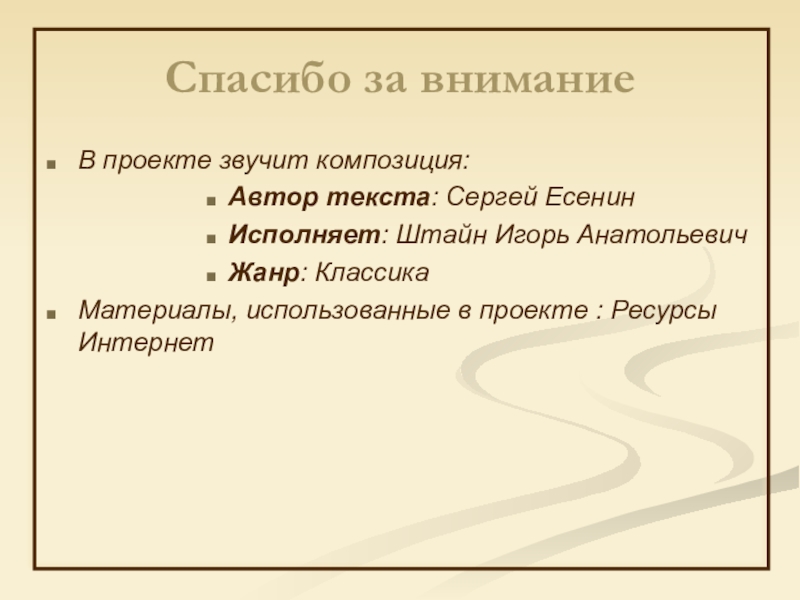Спасибо за вниманиеВ проекте звучит композиция:Автор текста: Сергей Есенин Исполняет: Штайн Игорь Анатольевич Жанр: КлассикаМатериалы, использованные в