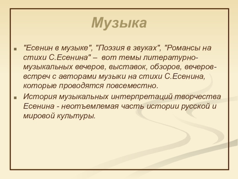 История музыкальных интерпретаций творчества Есенина - неотъемлемая часть истории русской и мировой культуры.