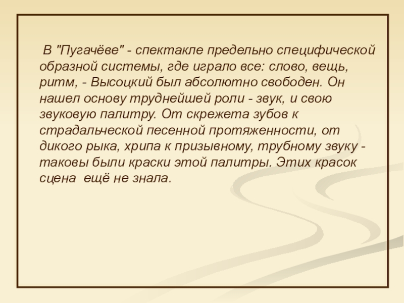образной системы, где играло все: слово, вещь, ритм, - Высоцкий был абсолютно свободен. Он нашел основу труднейшей роли - звук, и свою звуковую палитру. От скрежета зубов к страдальческой песенной протяженности, от дикого рыка, хрипа к призывному, трубному звуку - таковы были краски этой палитры. Этих красок сцена ещё не знала.