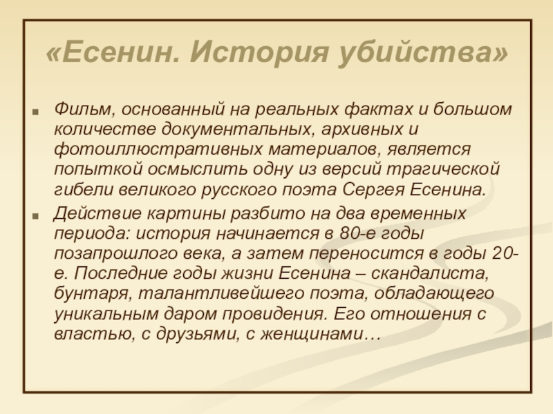 «Есенин. История убийства»Фильм, основанный на реальных фактах и большом количестве документальных, архивных и фотоиллюстративных материалов, является попыткой