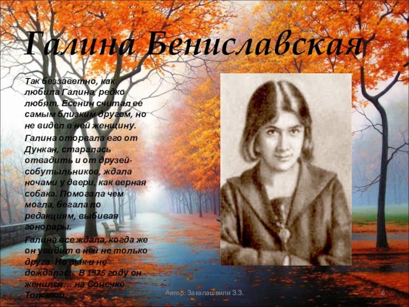 Женщин, любивших его, было много, а любви в его жизни было мало. Сам Есенин объяснял это так: «Как бы ни клялся я кому-либо в безумной любви, как бы я ни уверял в том же сам себя, — все это, по существу, огромнейшая и роковая ошибка. Есть нечто, что я люблю выше всех женщин, выше любой женщины, и что я ни за какие ласки и ни за какую любовь не променяю. Это — искусство…»