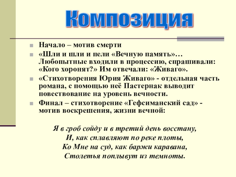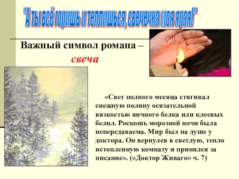 «Свет полного месяца стягивал снежную поляну осязательной вязкостью яичного белка или клеевых белил. Роскошь морозной ночи была непередаваема. Мир был на душе у доктора. Он вернулся в светлую, тепло истопленную комнату и принялся за писание». («Доктор Живаго» ч. 7)