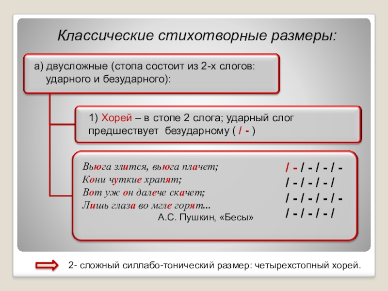 1) Хорей – в стопе 2 слога; ударный слог предшествует безударному ( / - )